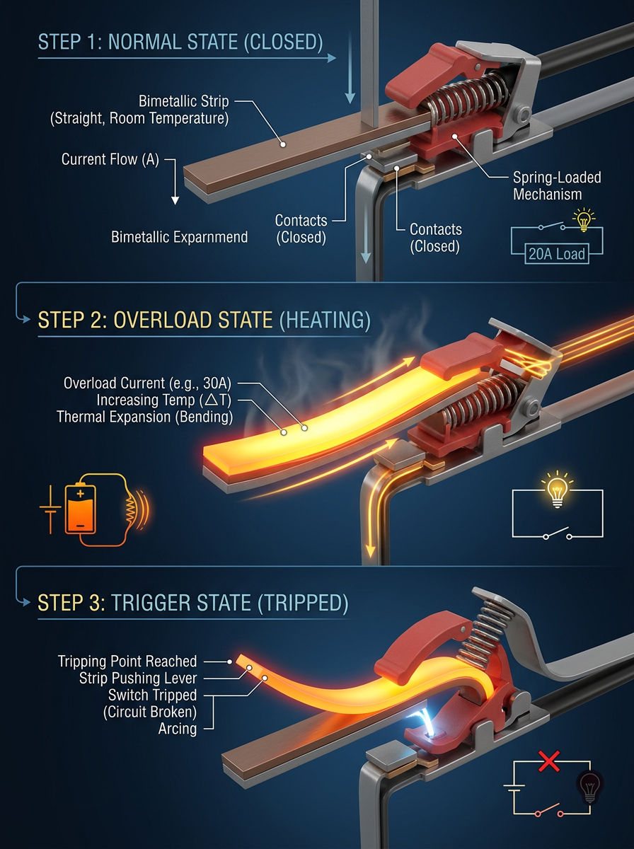 <b style="color:#ffb74d">Auslösung:</b> Das Bimetall drückt auf das Schaltschloss → Stromkreis wird unterbrochen