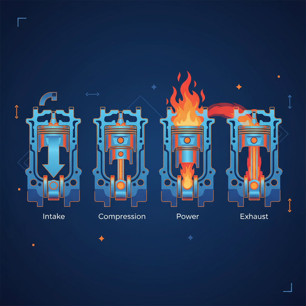 1. Впуск: Поршень идет вниз, смесь поступает в цилиндр.<br><br>2. Сжатие: Поршень идет вверх, сжимая смесь.<br><br>3. Рабочий ход: Искра воспламеняет смесь, газы толкают поршень вниз (энергия).<br><br>4. Выпуск: Поршень выталкивает отработанные газы.