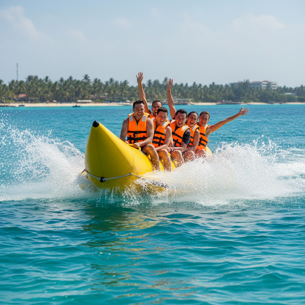 A fun group activity where you hold on tight to a yellow inflatable boat towed by a speedboat.