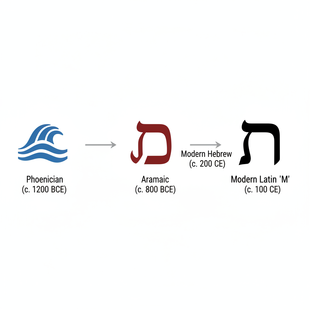 The letter Mem originated from the Proto-Sinaitic script, where it represented waves of water (Mayim). Over centuries, it evolved from a jagged wave pictograph into the standardized square Ashuri script we recognize today.