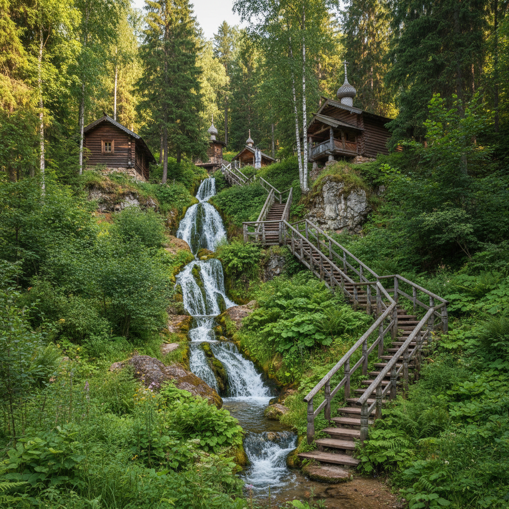 Место силы на границе областей. Подворье Троице-Сергиевой Лавры славится своими источниками, бьющими из склона холма. Вода здесь считается целебной, температура всегда +4-5°С. Территория благоустроена: деревянные храмы, купальни и лестницы создают уникальный архитектурный ансамбль среди природы.