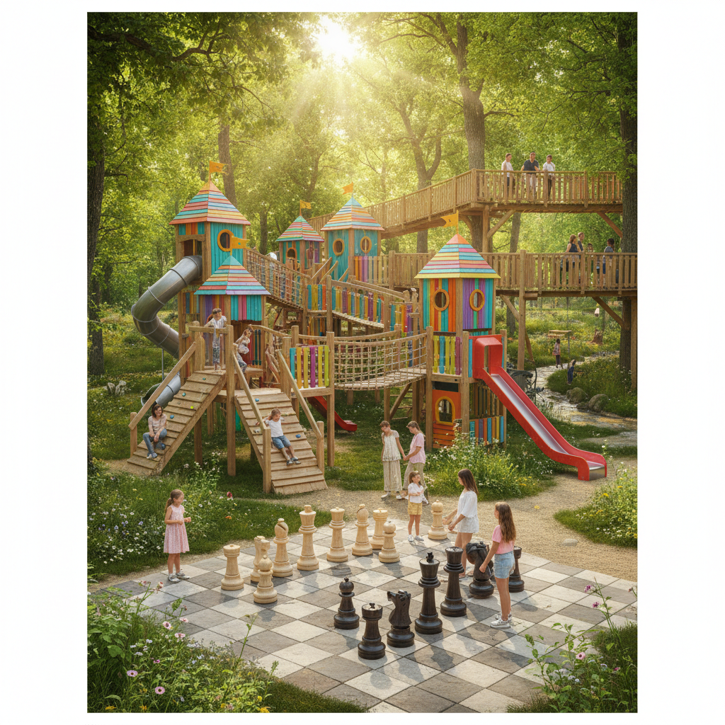 Погружение в детство всего в 15 км от города. Огромная площадка с качелями всех видов, скалодромами, библиотекой и музеем под открытым небом. Здесь можно сыграть в гигантские шахматы, собрать замок из огромных блоков или просто прогуляться по деревянным настилам. Идеальное место для семейного уикенда.
