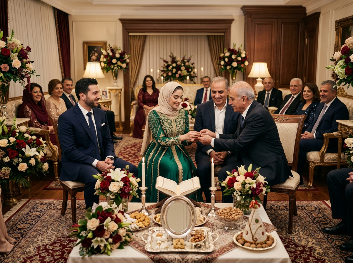 C'est une réunion officielle. On parle de la dot (mahr) et des conditions du mariage. À la fin, la fille dit oui.