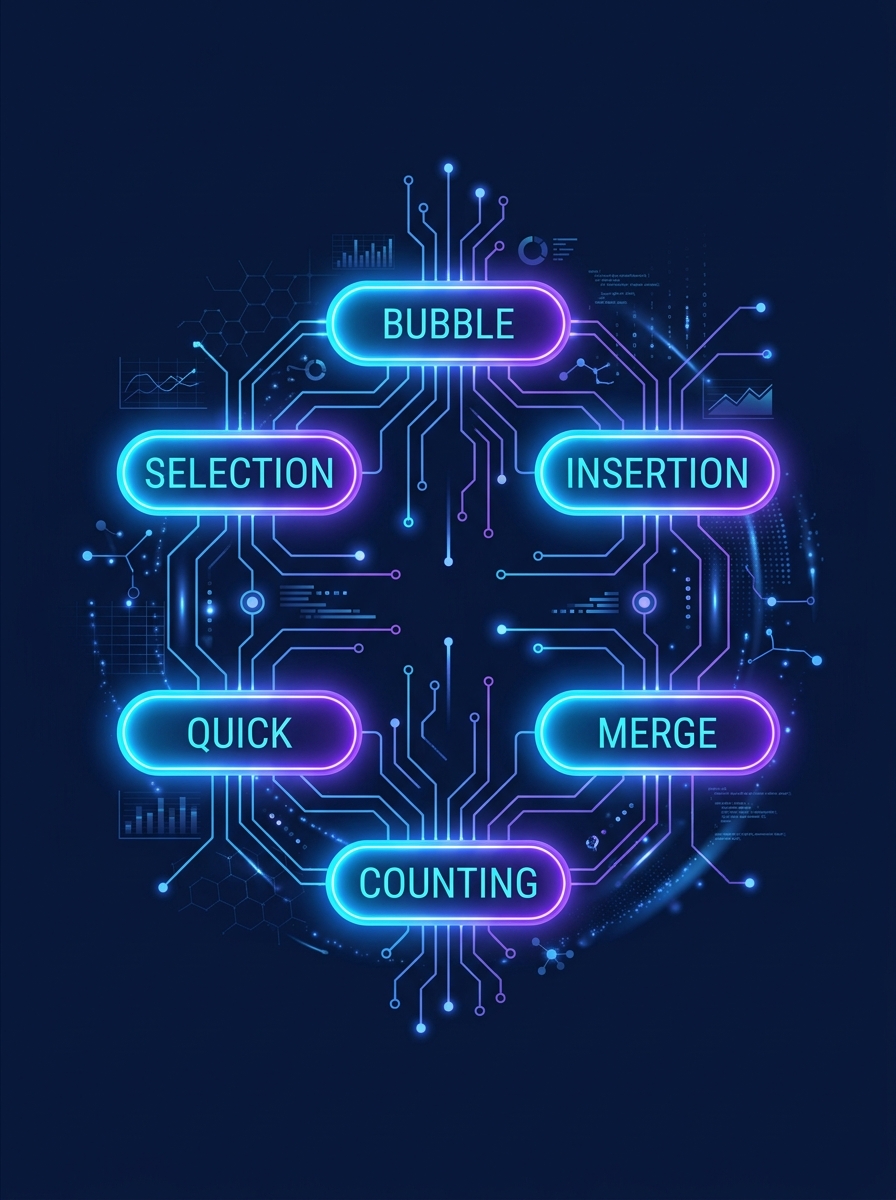 Supports 6 sorting algorithms — Bubble, Selection, Insertion, Merge, Quick, Counting Sort for comprehensive comparison.