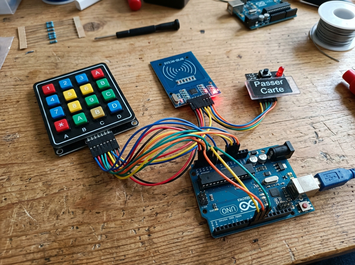 void loop() { char key = keypad.getKey(); if (key == '#') { attenteID = true; attCode = false; currentCode = ""; badgeIndex = -1; lcd.clear(); lcd.setRGB(255, 255, 255); lcd.print("Presentez badge"); return; } if (attenteID) { if (mfrc522.PICC_IsNewCardPresent() && mfrc522.PICC_ReadCardSerial()) { gestionSaisie(); // Update UI for (int i = 0; i < 2; i++) { if (checkUID(mfrc522.uid.uidByte, uids[i])) { badgeIndex = i; break; } } if (badgeIndex != -1) { attenteID = false; attCode = true; lcd.clear(); lcd.setRGB(0, 0, 255); // Blue lcd.print("Code PIN:"); } } } if (attCode && key) { currentCode += key; lcd.setCursor(0, 1); lcd.print(currentCode); if (currentCode.length() == 4) { if (currentCode == codes[badgeIndex]) { lcd.clear(); lcd.setRGB(0, 255, 0); // Green lcd.print("Acces autorise"); } else { lcd.clear(); lcd.setRGB(255, 0, 0); // Red lcd.print("Code incorrect"); } delay(3000); setup(); // System reset } } }