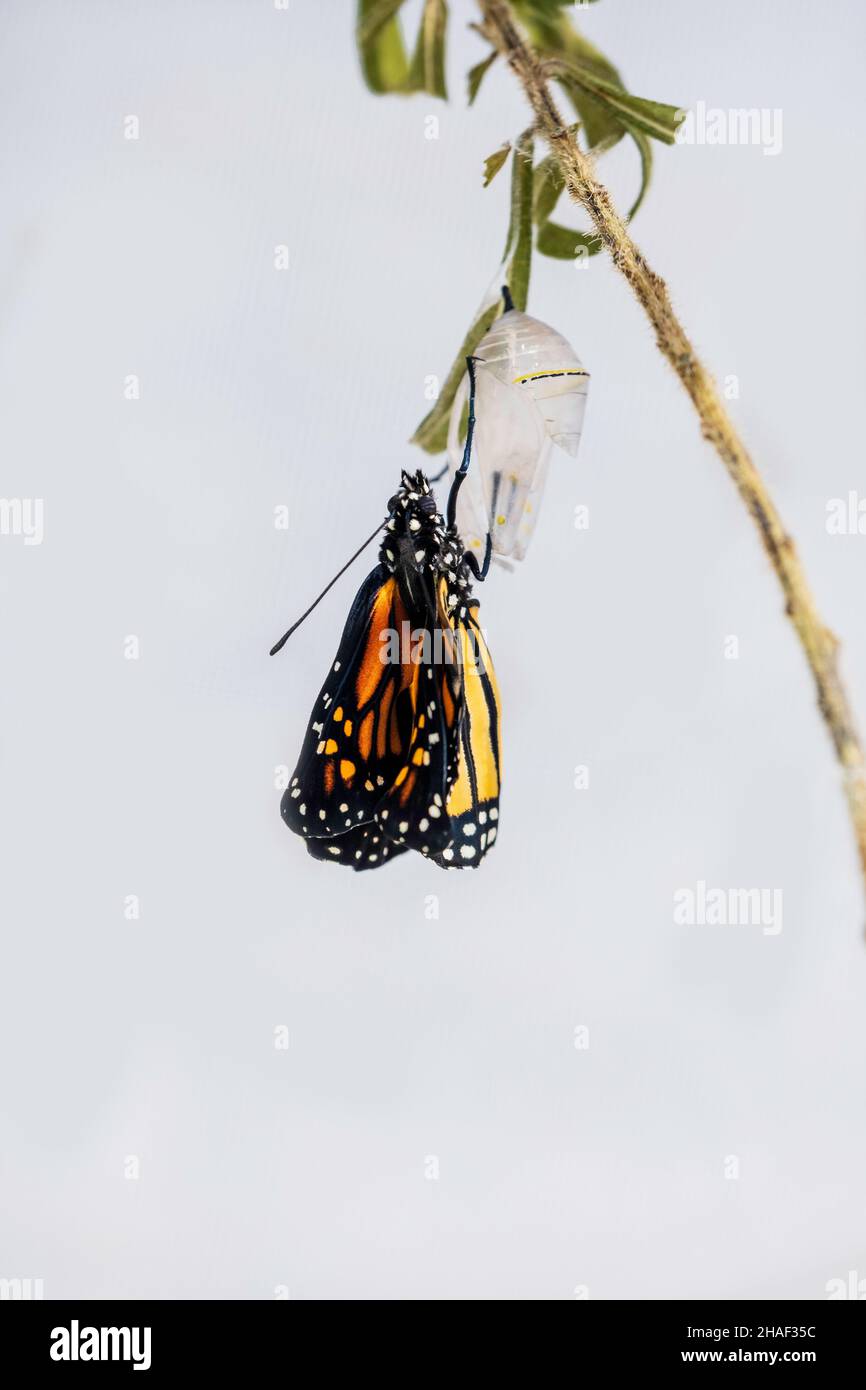 The caterpillar hangs upside down and forms a hard shell. Inside, its body is changing rapidly.