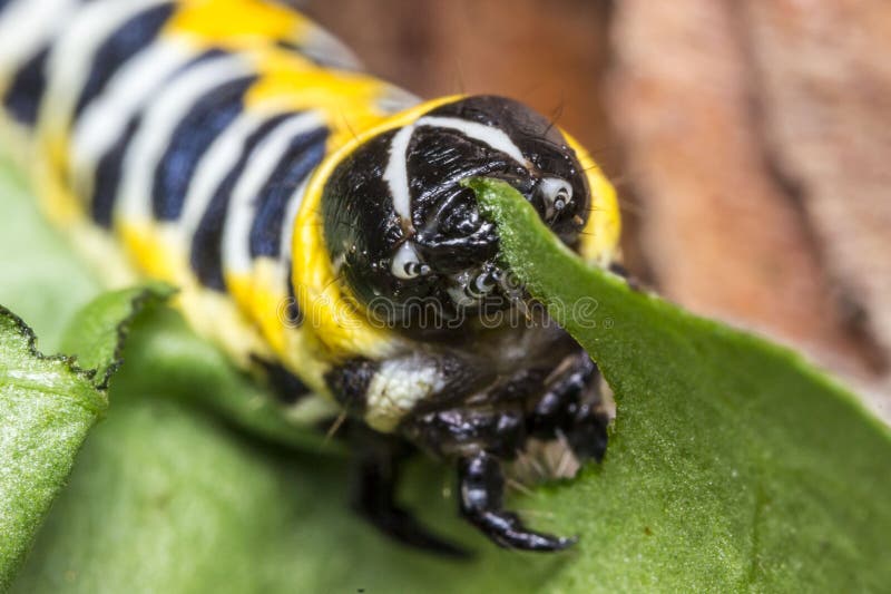 The egg hatches into a larva. We call this a caterpillar. It spends all its time eating leaves and growing bigger.
