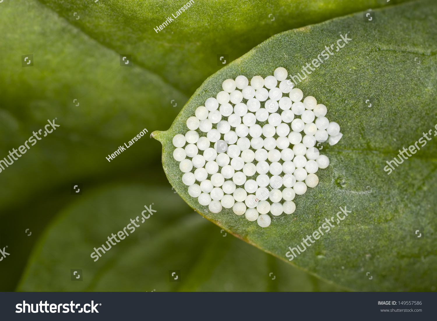A female butterfly lays tiny eggs on a leaf. They are very small and round or oval.