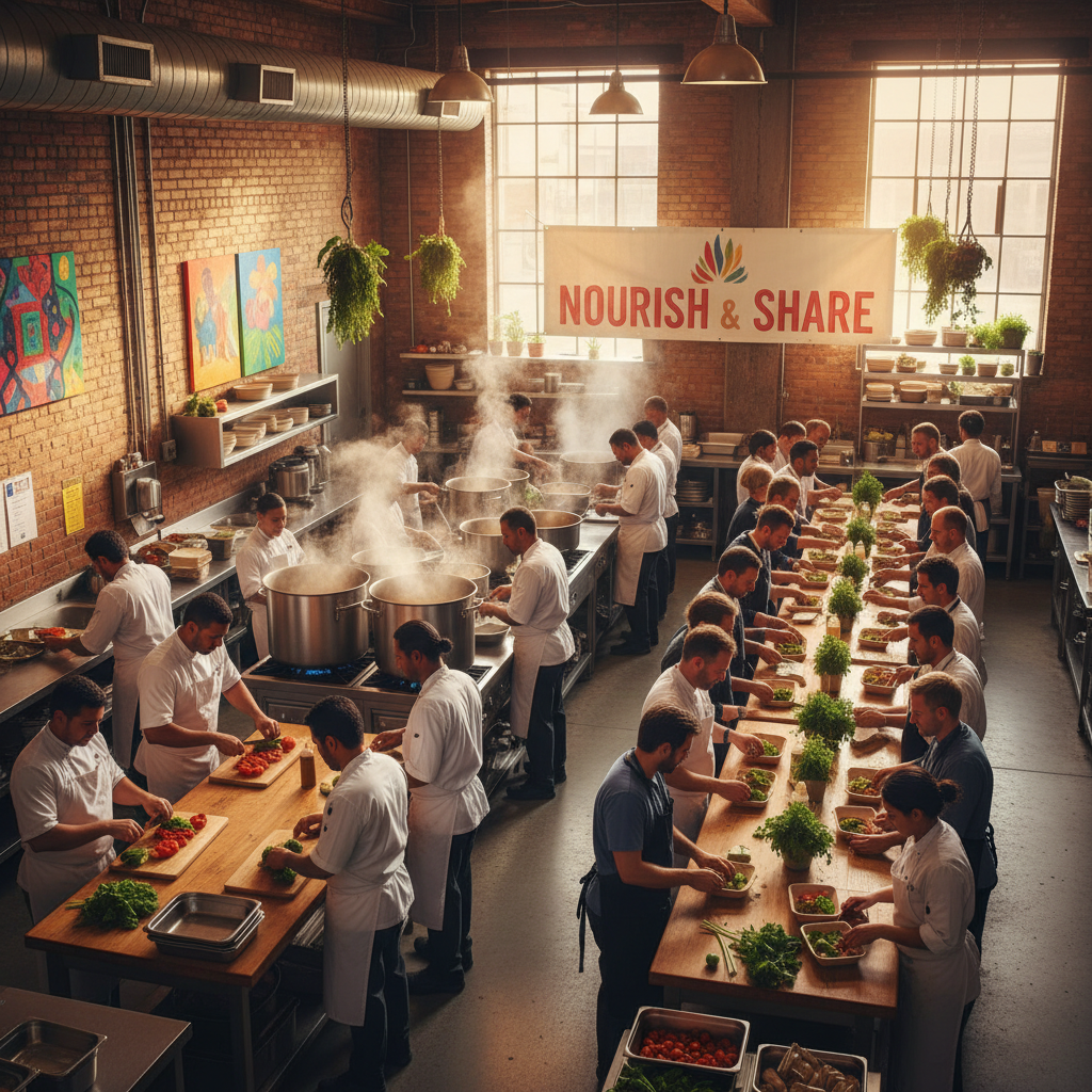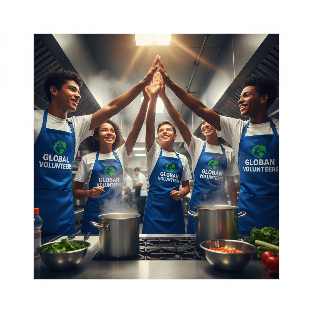 It starts in the kitchen. Chop, stir, and package meals alongside local chefs. No experience needed—we train you on the spot. It's fast-paced, high-energy, and satisfying.