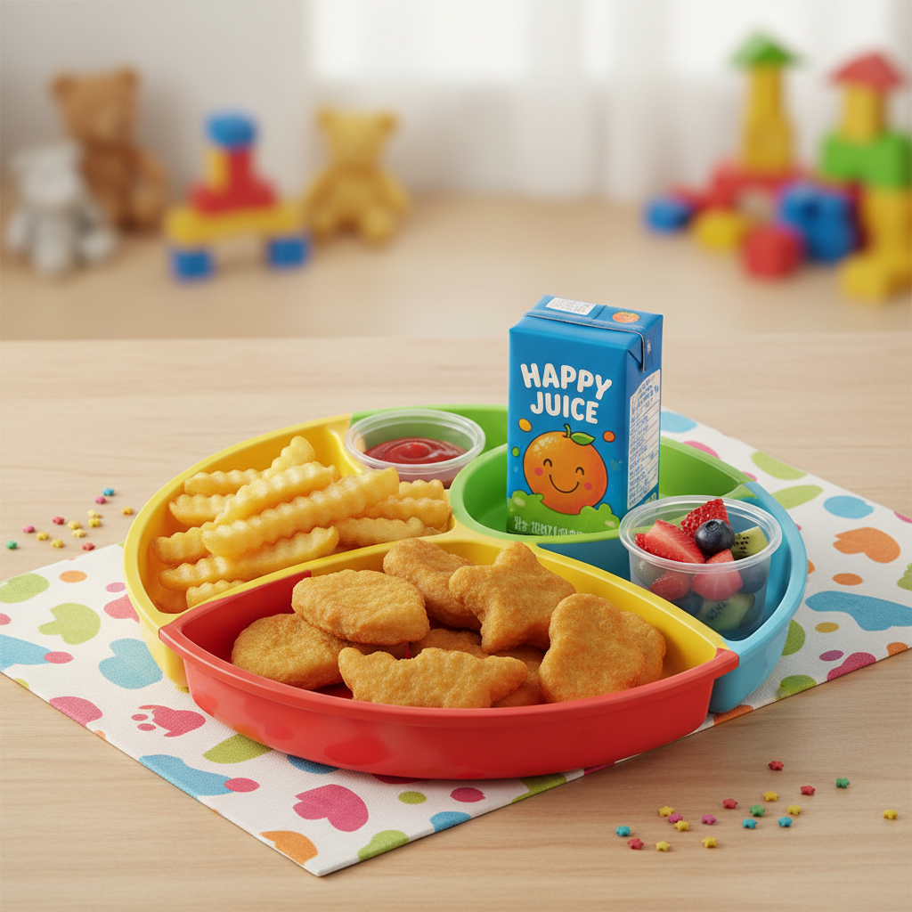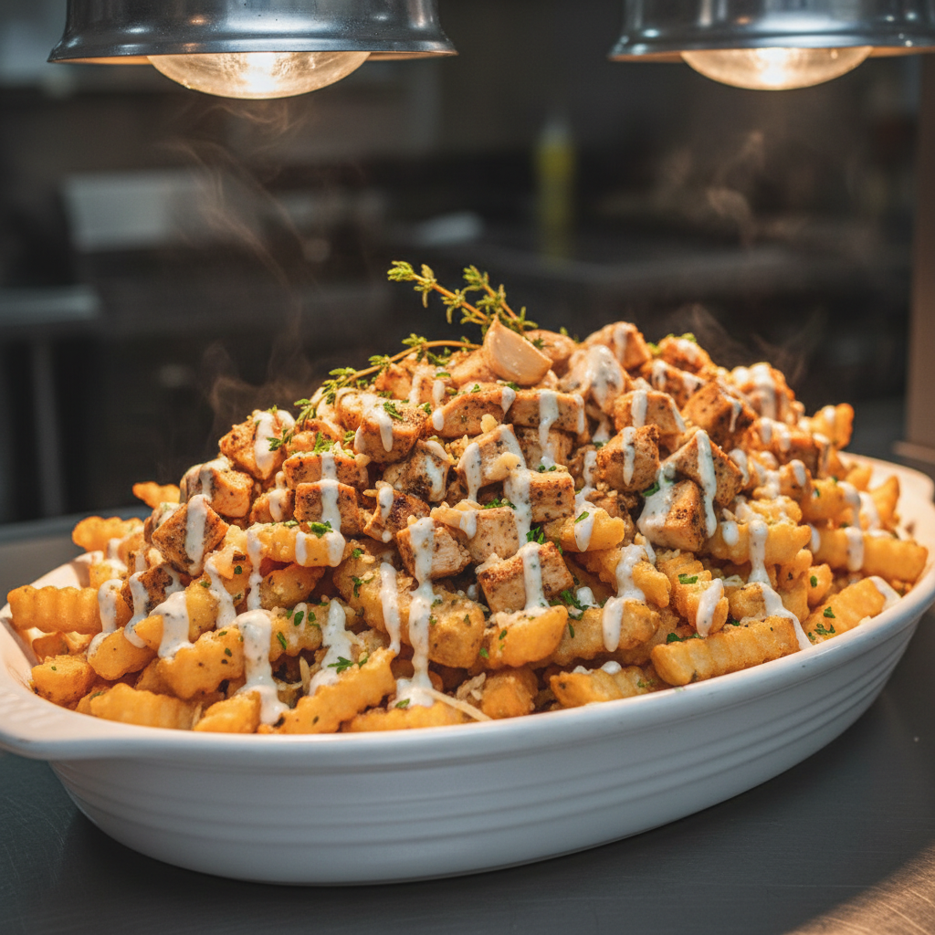 14 oz French Fries<br/>1 t Coarse Salt<br/>3.5 oz Chicken Tenders<br/>2 oz Cheddar Jack, shredded<br/>1 fl oz Garlic Parm Sauce<br/>1 fl oz Ranch Dressing<br/>1 T Parmesan Cheese