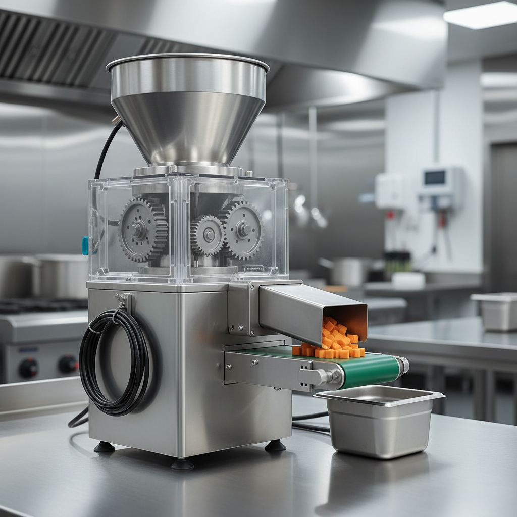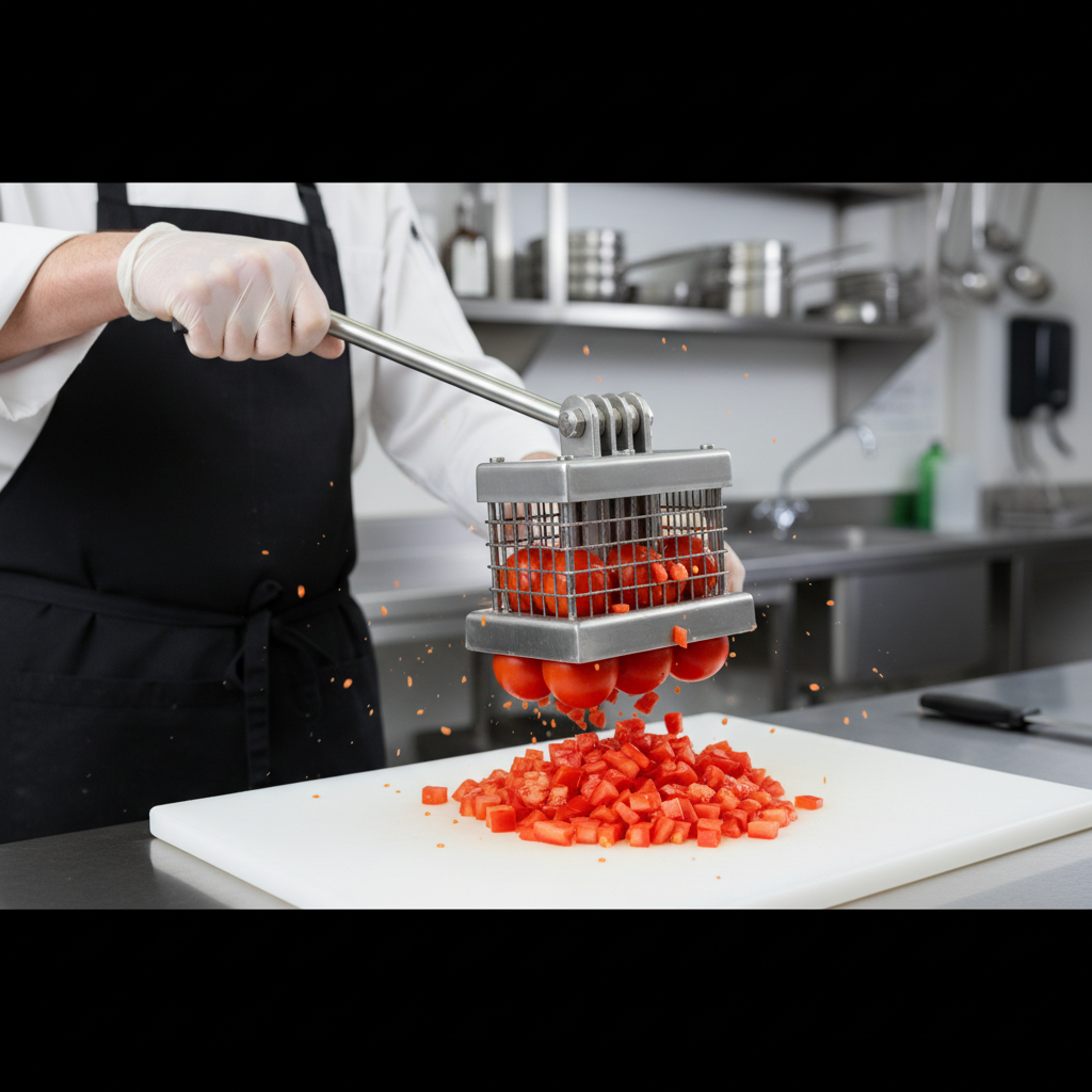 Set up dicing machine on sheet tray. Insert sliced tomato one at a time to avoid bruising.