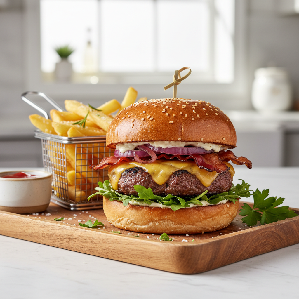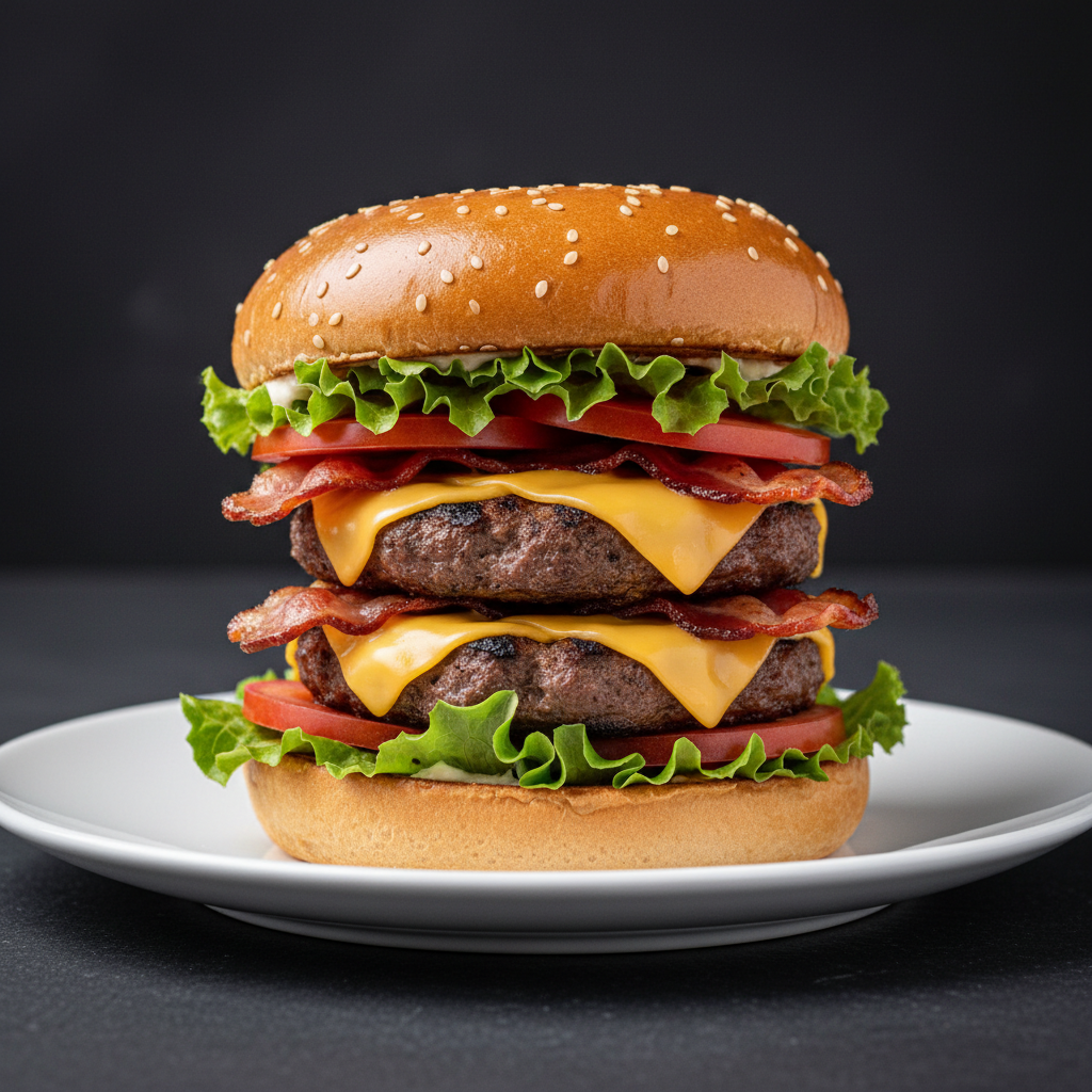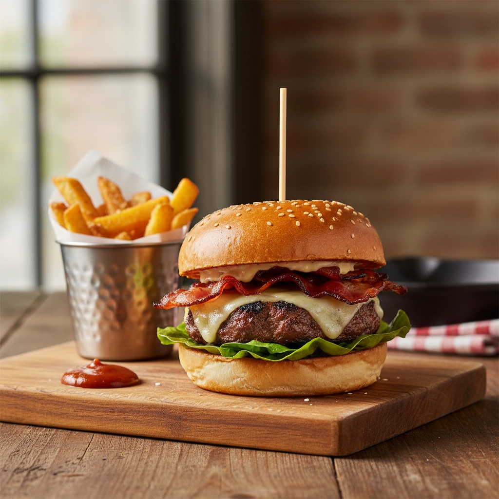 1 ea Bun<br/>1 ea Beef Patty<br/>1 T Oh Canada Seasoning<br/>1 ea Cheddar Cheese slice<br/>1 T Slap Sauce<br/>3 ea Pickles<br/>.75 oz Spring Mix<br/>2 ea Bacon<br/>1 ea Tomato, sliced