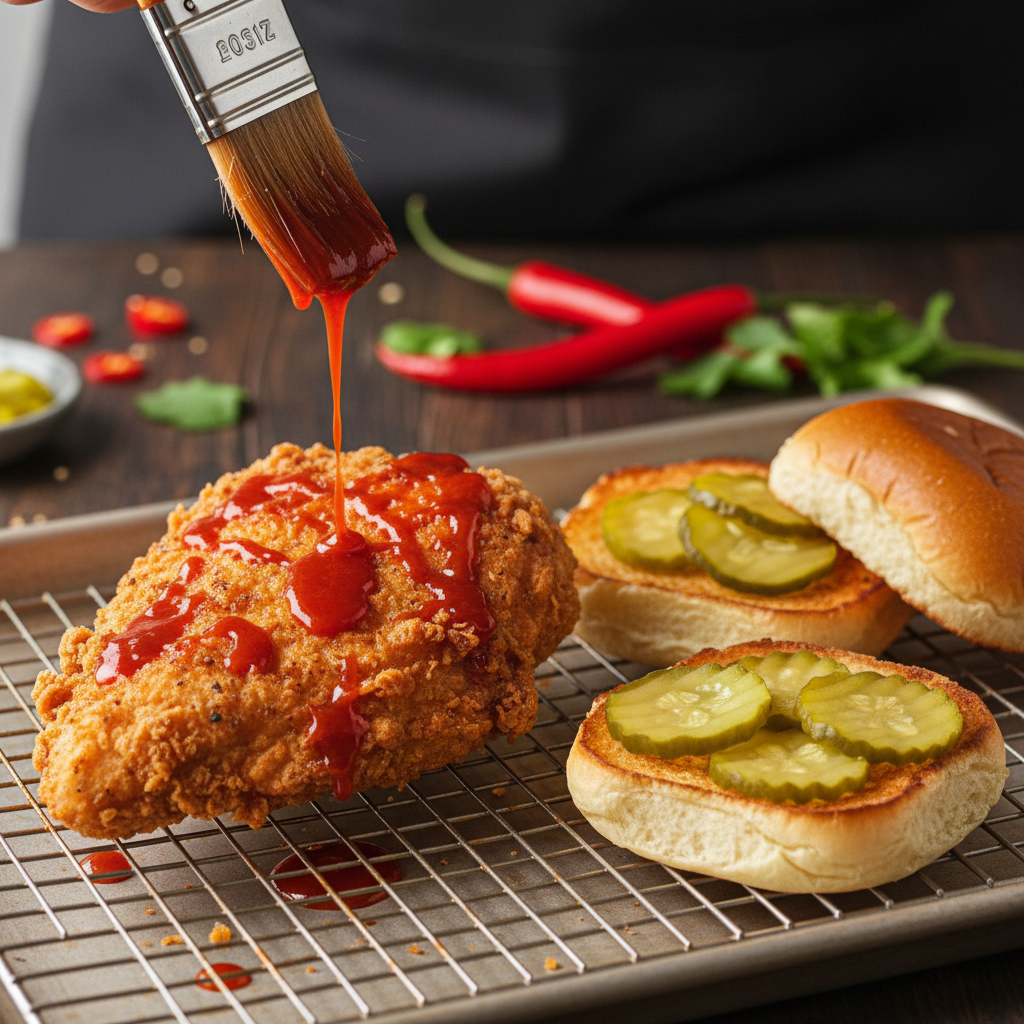 4 ea Slider Buns<br/>1 ea Marinated Chicken Breast<br/>As needed Seasoned Flour/Buttermilk<br/>4 ea Pickle Slices<br/>2 oz Dressed Coleslaw<br/>2 fl oz Nashville Hot Sauce