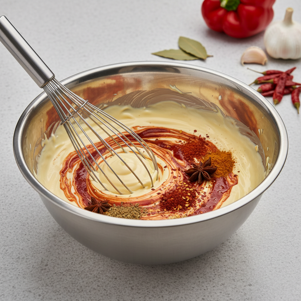 1 Gal Mayonnaise<br/>64 fl oz Nashville Hot Sauce<br/>.25 cup Tajin Fruit Seasoning