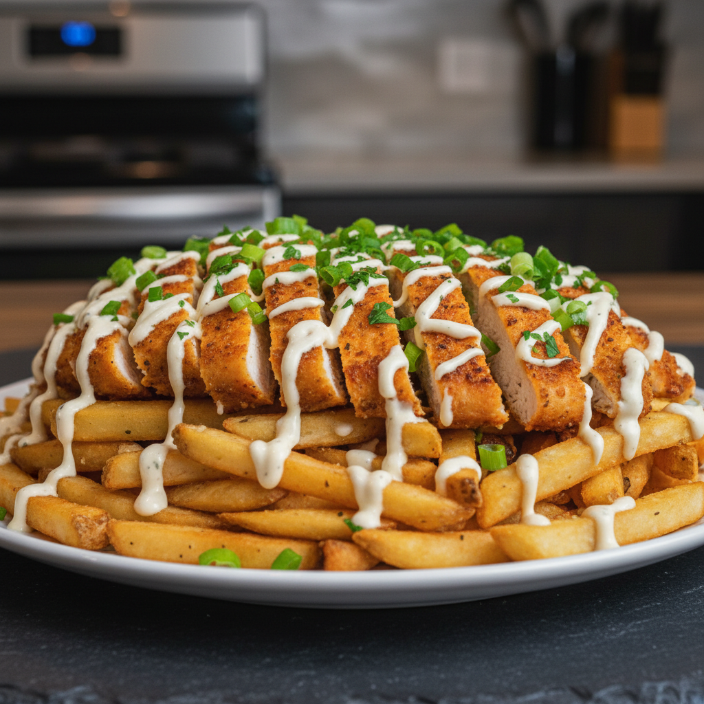 1/2 inch slice tenders, distribute over fries. Drizzle sauces in criss-cross. Garnish with parmesan.