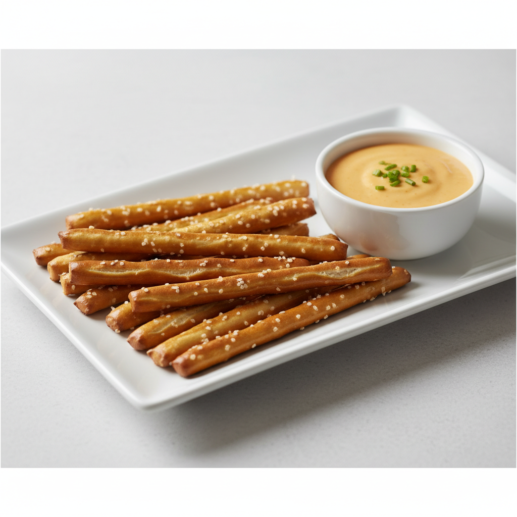 3 ea Bavarian Pretzel Sticks<br/>3 fl oz Queso<br/>2 T Garlic Oil<br/>As Needed Pretzel Salt
