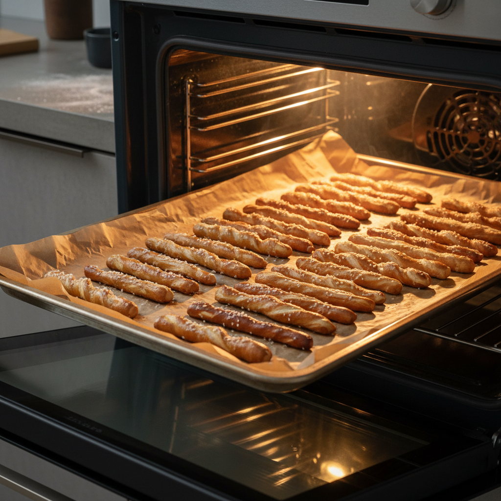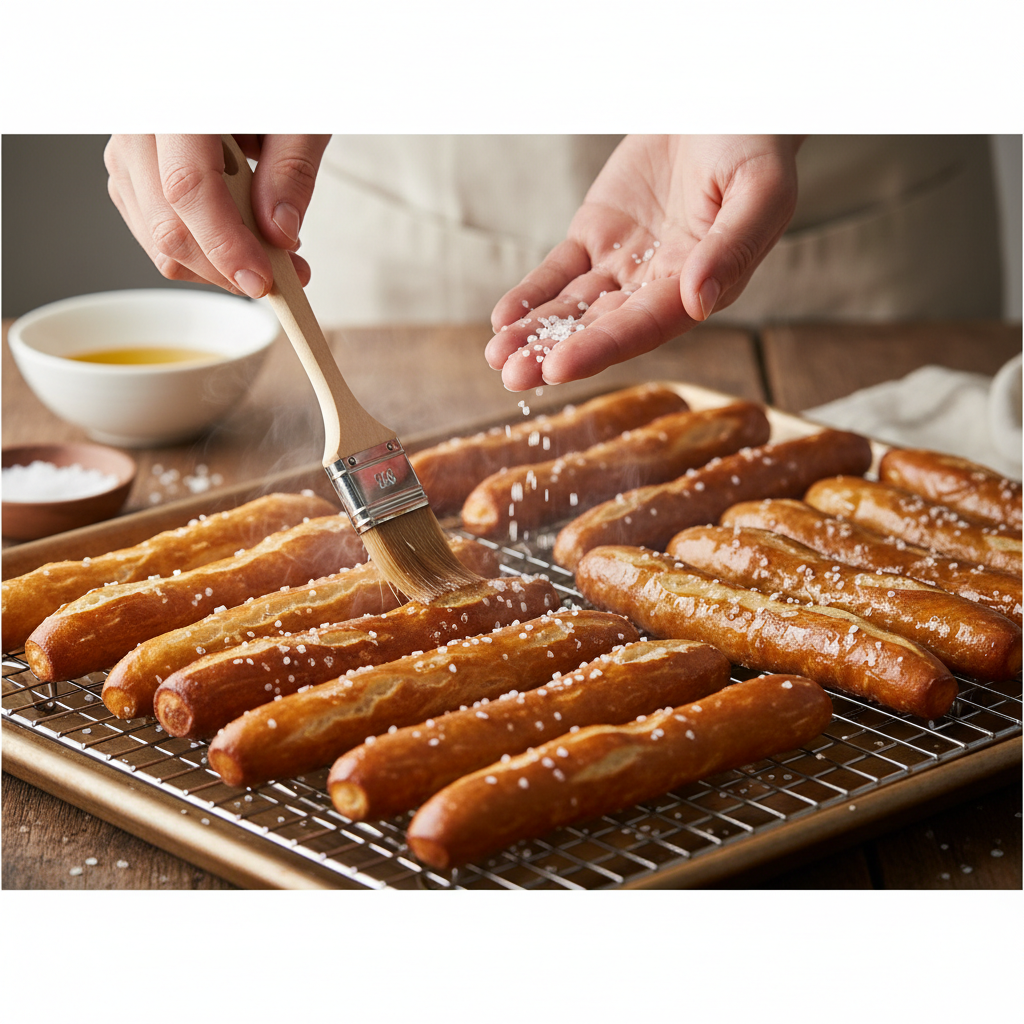 Remove from oven. Brush with garlic oil and press presentation side into pretzel salt.