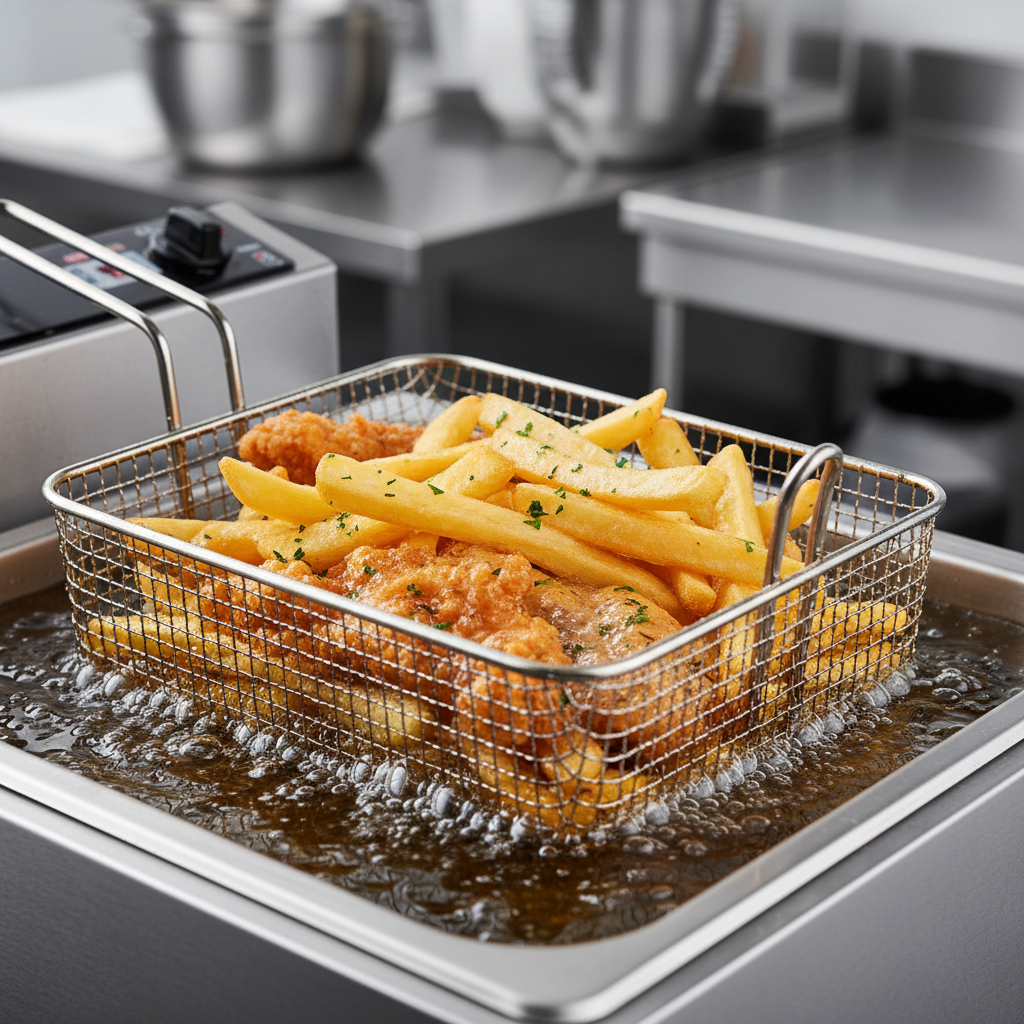 Fry Tenders 6-8 min; Fries 3-3.5 mins. Season fries with coarse salt in bowl.
