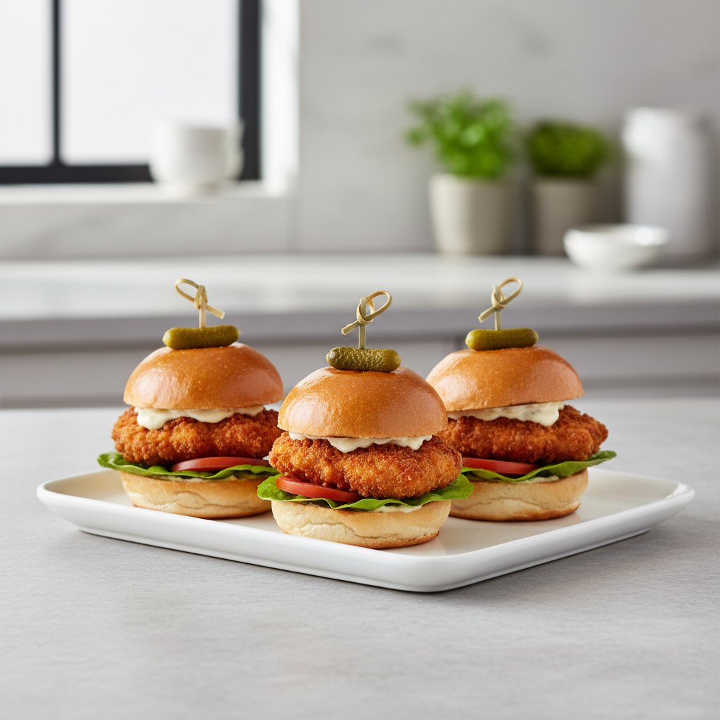 Toast 4 slider buns. Add one pickle per bun. Add 2 oz coleslaw to top cluster. Brush fried chicken with Hot Sauce.