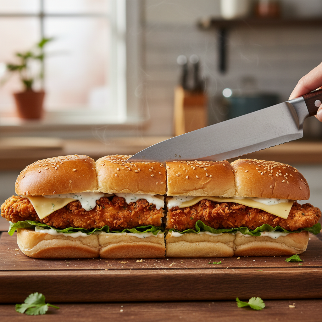 Transfer chicken to bottom bun, close sandwich. Secure with picks. Cut along divisions.