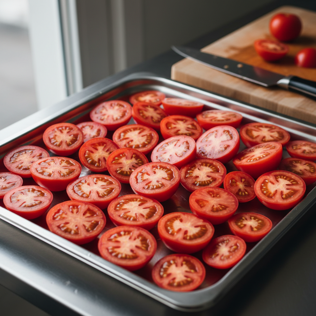 Collect scraps or slice fresh. Utilize all ends or unusable tomato slices before slicing additional whole tomatoes.