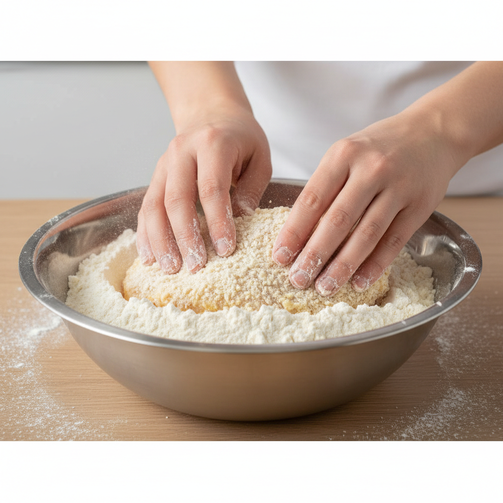Put back into flour. Flip and pack. Ensure complete coverage. Shake off excess.