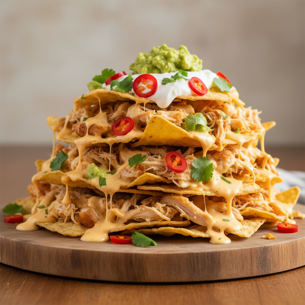 Add remaining chips portion and ladle remaining queso evenly over chips. Spread remaining protein over chips and queso.
