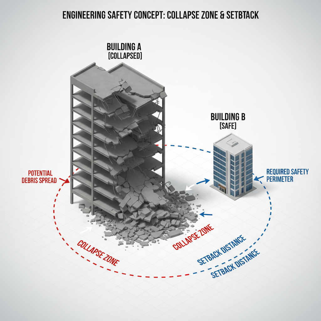 Collapse Zone Requirement: The shelter must be set back to ensure that if adjacent non-shelter structures collapse, they do not compromise the shelter's structural integrity or exit.