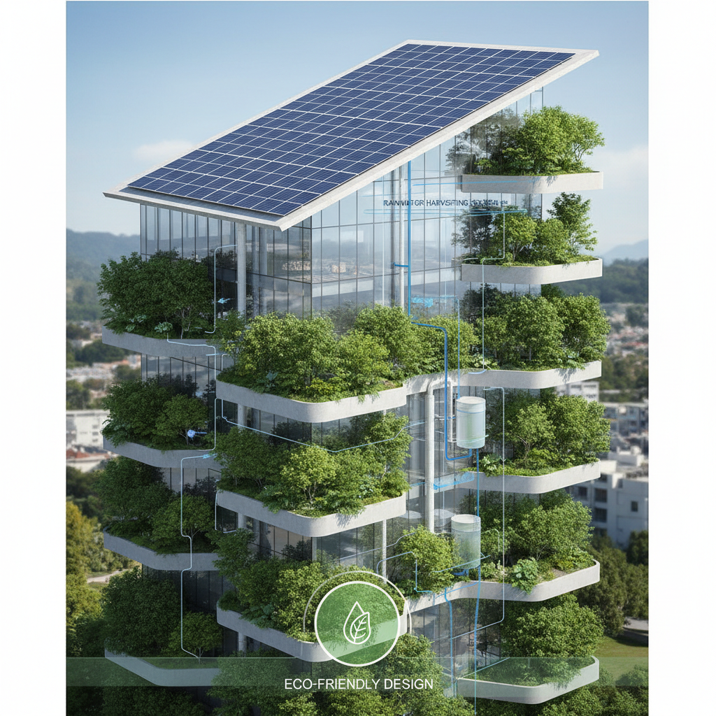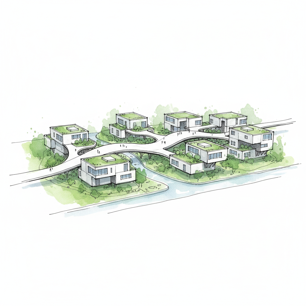 Water Neutrality: 100% on-site rainwater retention via swales and cisterns.