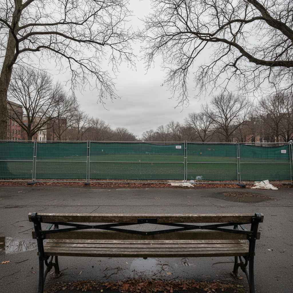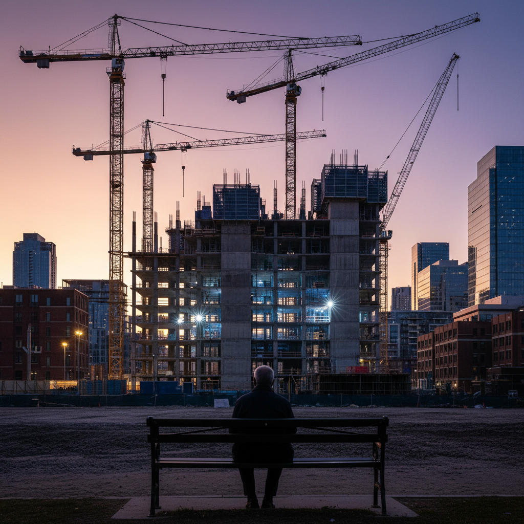 המקומות בהם נהגנו לשבת ולהיפגש נעלמים לטובת בנייה חדשה. הספסל הריק מסמל את חוסר המקום הפיזי והחברתי.
