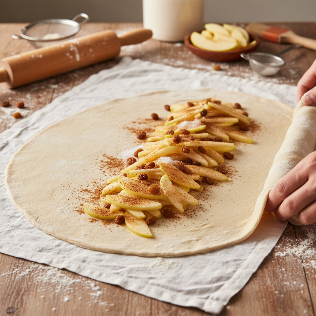 Frucht: Äpfel werden oft vorgedünstet oder mit Kompott gebunden, damit der Boden nicht durchweicht.
