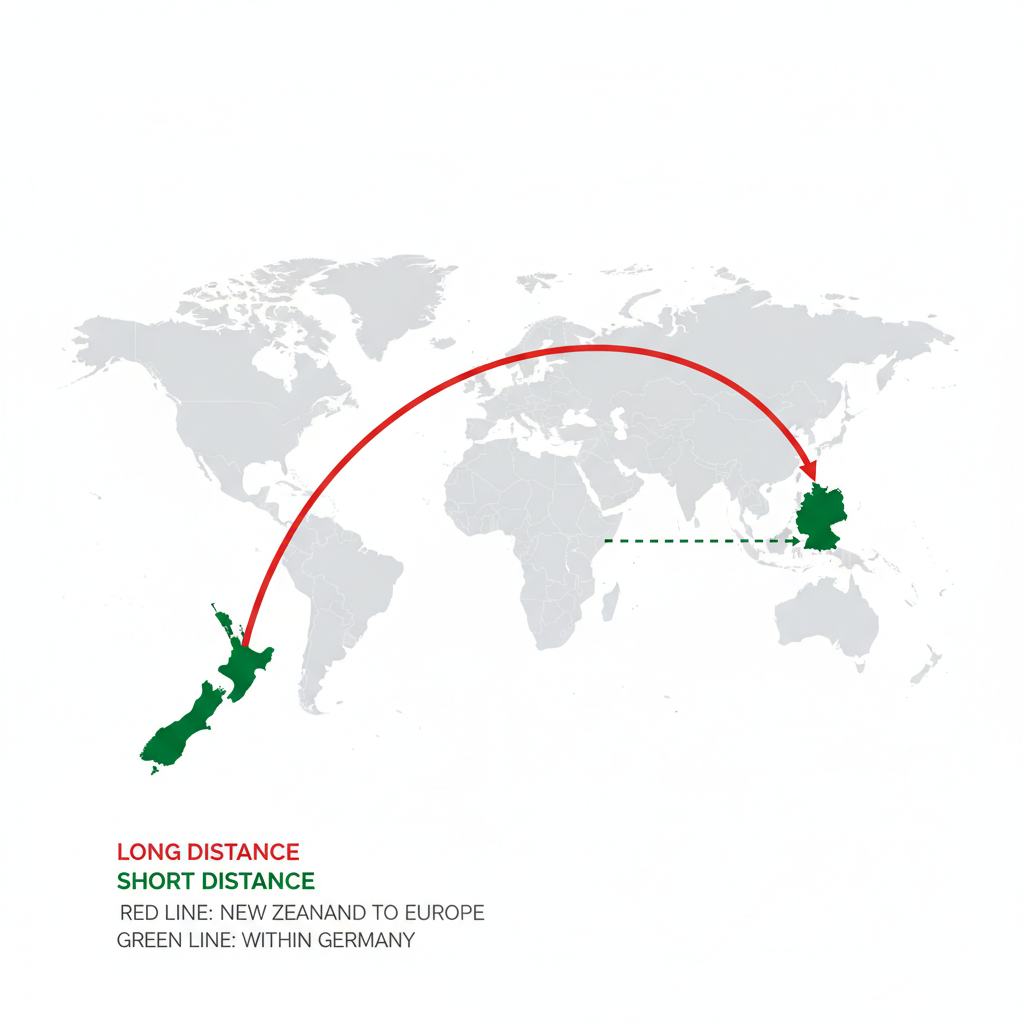 Der Transportweg spielt eine entscheidende Rolle. Während ein Schiffstransport pro km effizient ist, summiert sich die enorme Distanz. Zudem fallen für Kühlung während der wochenlangen Fahrt zusätzliche Emissionen an.