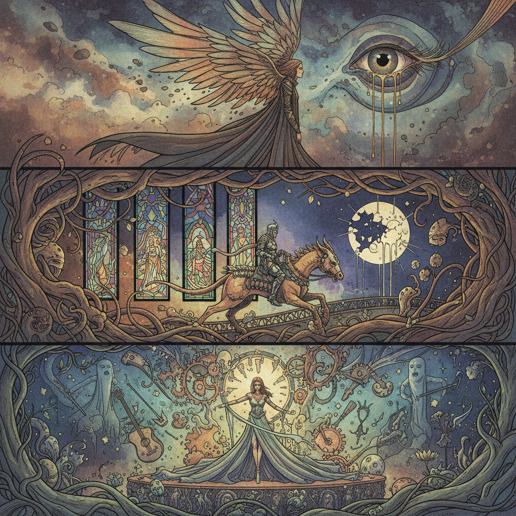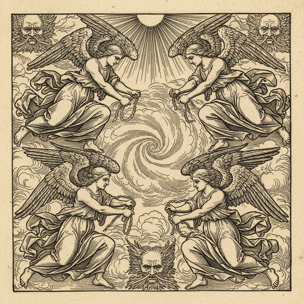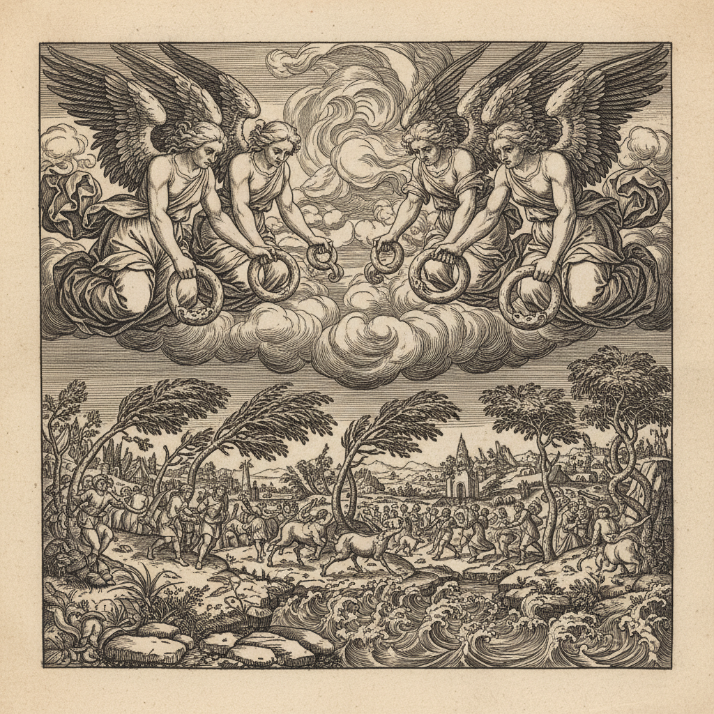 Pirmie pasaku vizuālie tēli parādījās ilgi pirms ierastajām grāmatām.<br><br><b>1496. gads — Ksilogrāfija</b><br>Tā ir drukas tehnika no koka plates, kur attēls tiek izgriezts ar rokām. Katra līnija prasīja grebēja meistarību.<br><br><i>Piemērs: Eņģeļi, kas aiztur četrus vējus (Apokalipse).</i>