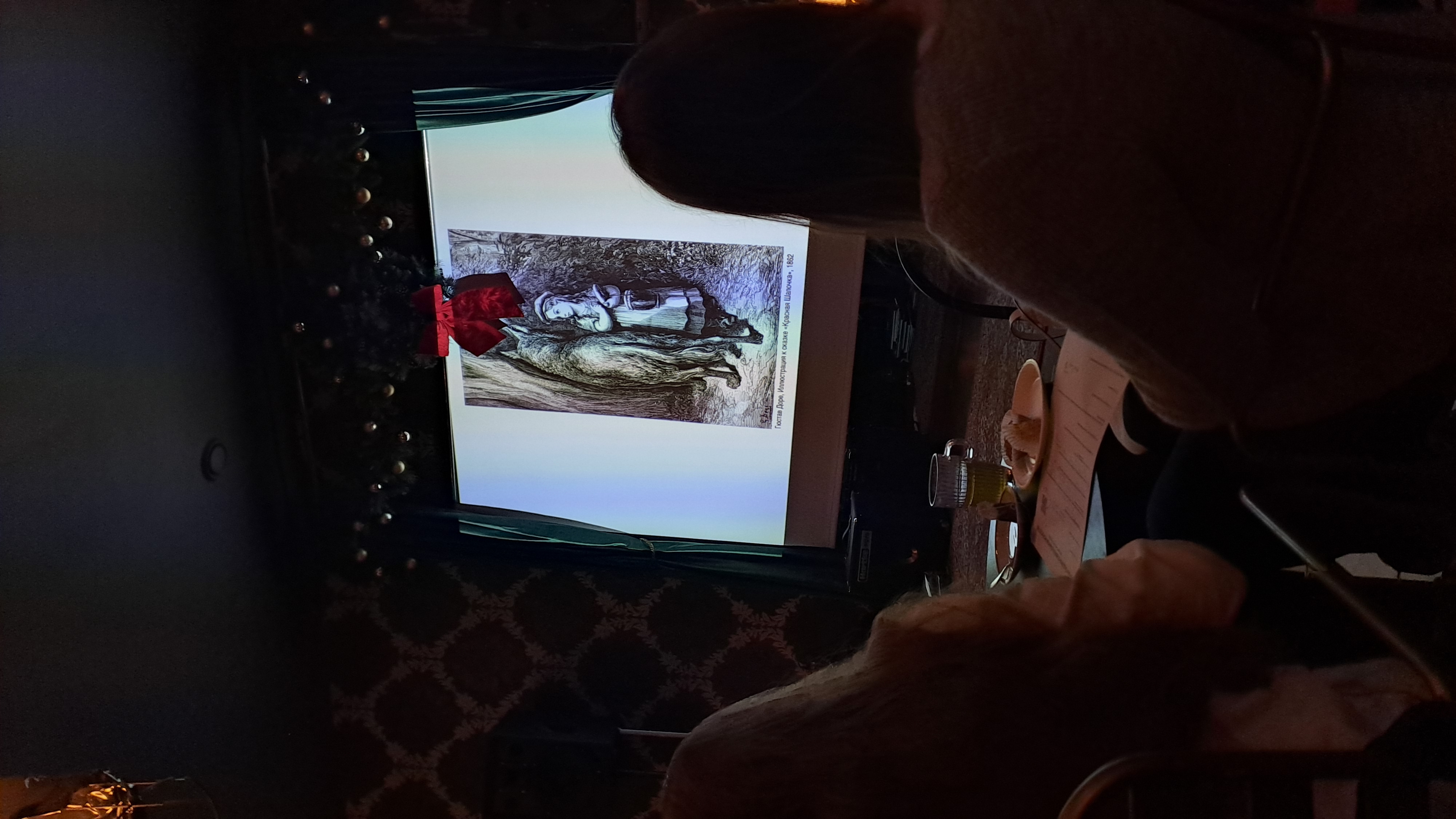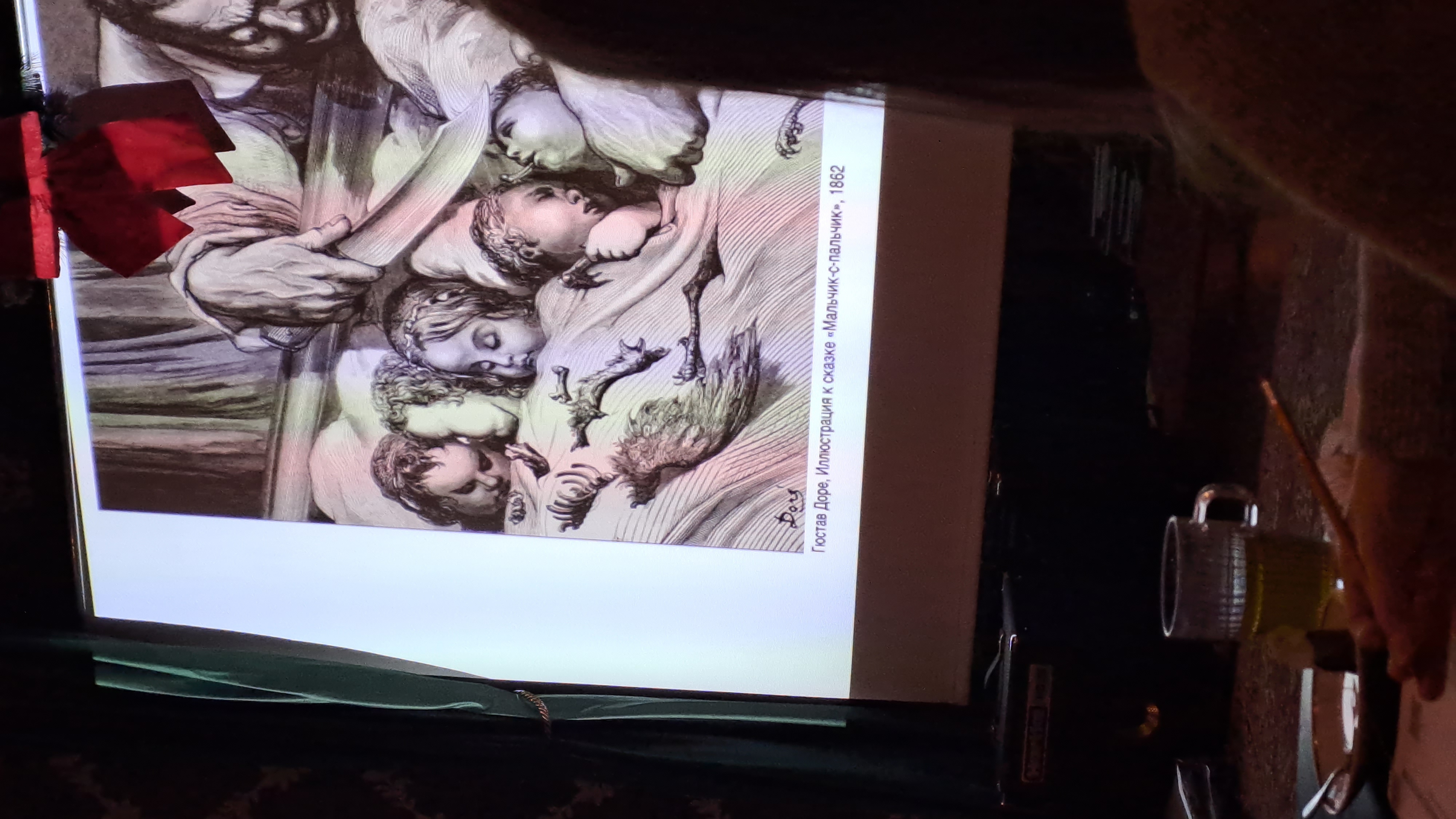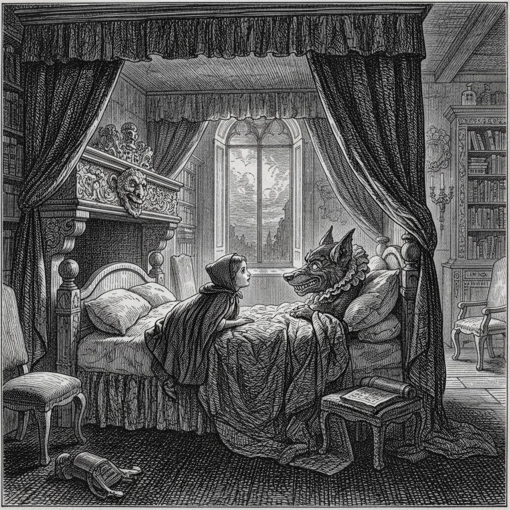 1862. gada ilustrācijas pasakām "Sarkangalvīte" un "Īkšķītis". Dorē zīmējumi piešķīra pasakām drūmu, bet elpu aizraujošu atmosfēru.