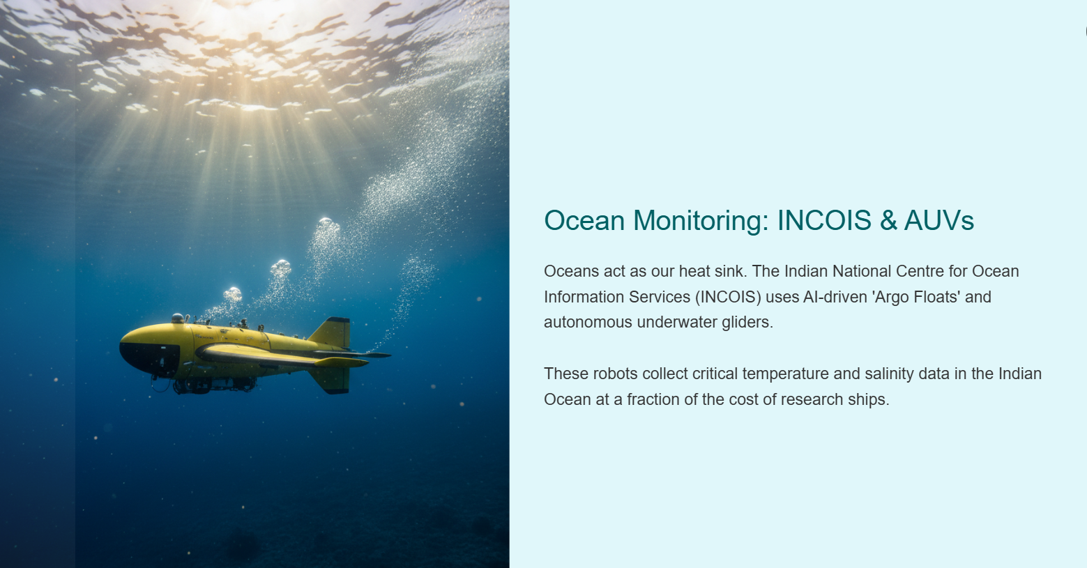 Oceans are the planet's heat sink. AI-powered robotics make monitoring affordable and scalable. • **Innovator**: INCOIS (Hyderabad) deploys AI-driven 'Argo Floats' and autonomous underwater gliders. • **Data**: Collects real-time temperature and salinity data in the Indian Ocean at a fraction of ship costs.