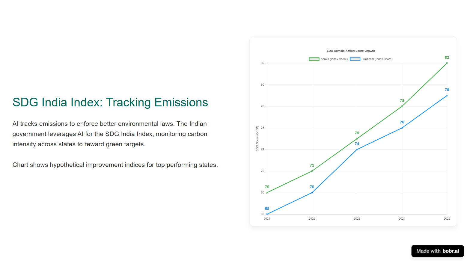 AI empowers governments to track emissions and enforce environmental laws. • **Strategy**: The SDG India Index uses AI to monitor progress toward Sustainable Development Goals. • **Mechanism**: Tracks carbon intensity across states to identify leaders and lagards. • **Result**: Rewards states meeting green targets.