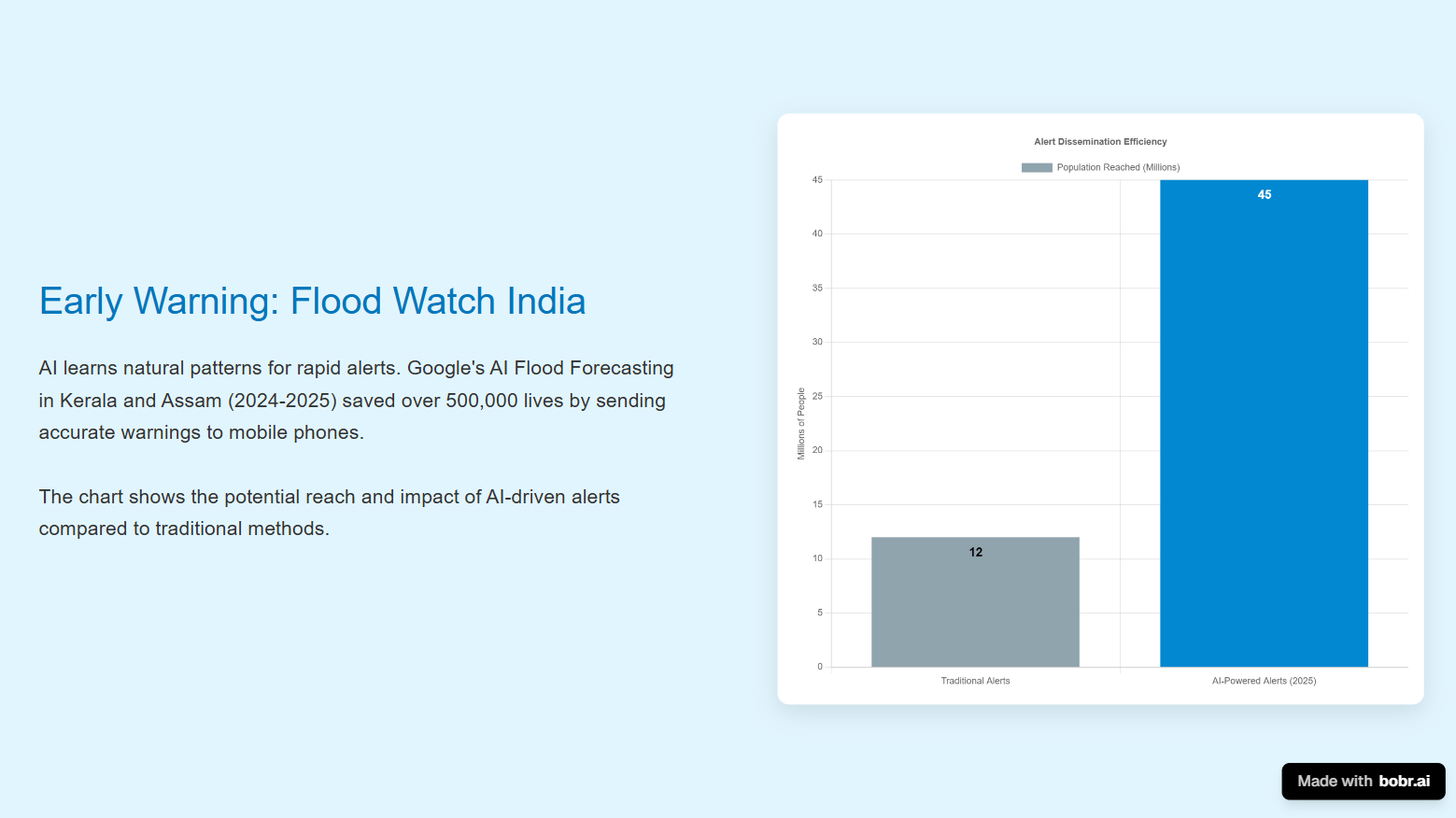 AI learns natural patterns to alert authorities about floods, aiding in evacuation and rescue. • **Kerala & Assam (2024-25)**: Google's AI Flood Forecasting deployed. • **Lives Saved**: Accurate mobile alerts via 'Flood Watch India' app saved over 500,000 lives. • **Reach**: Targeted warnings exceed traditional methods.