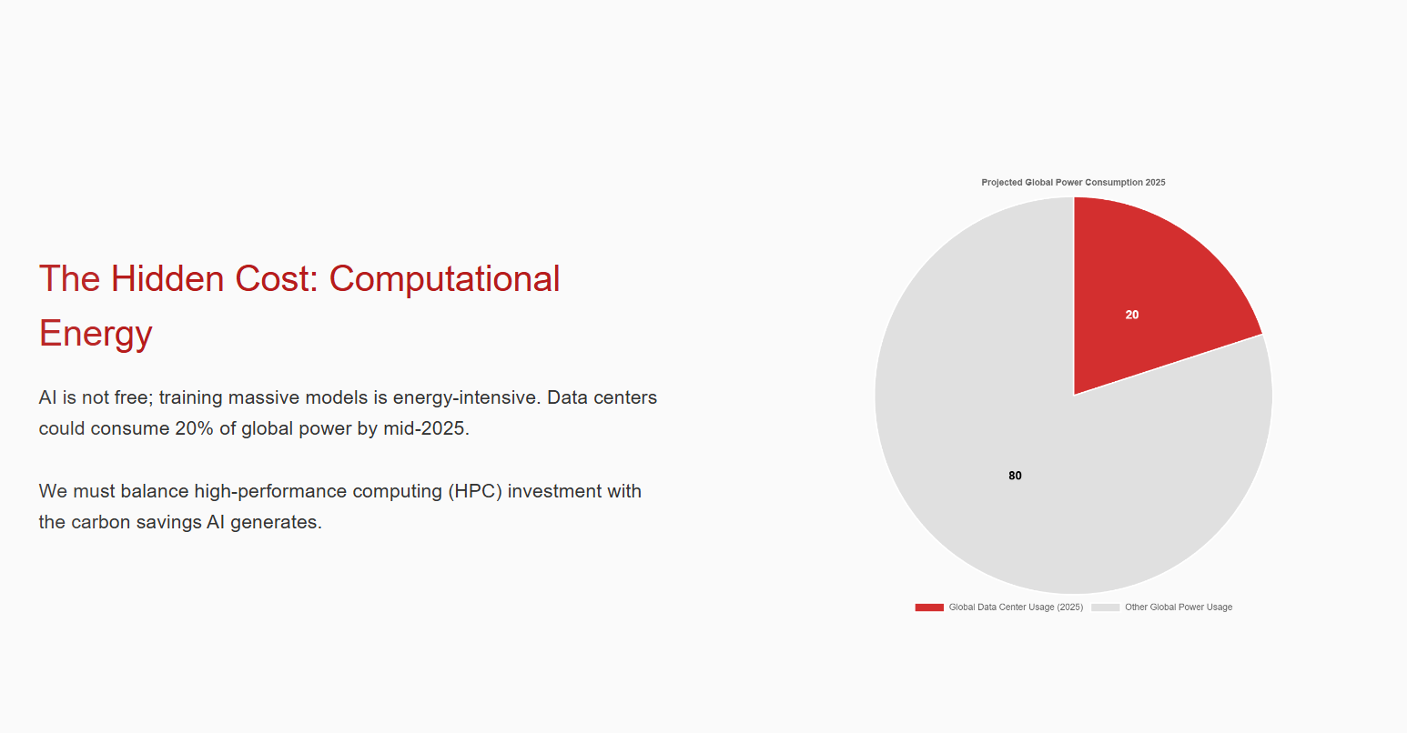 AI offers solutions, but it is not 'free' to run. • **Challenge**: Training massive models requires immense energy and high-performance computing (HPC). • **Imperative**: We must ensure the carbon saved by AI solutions is greater than the carbon emitted to train and run them.