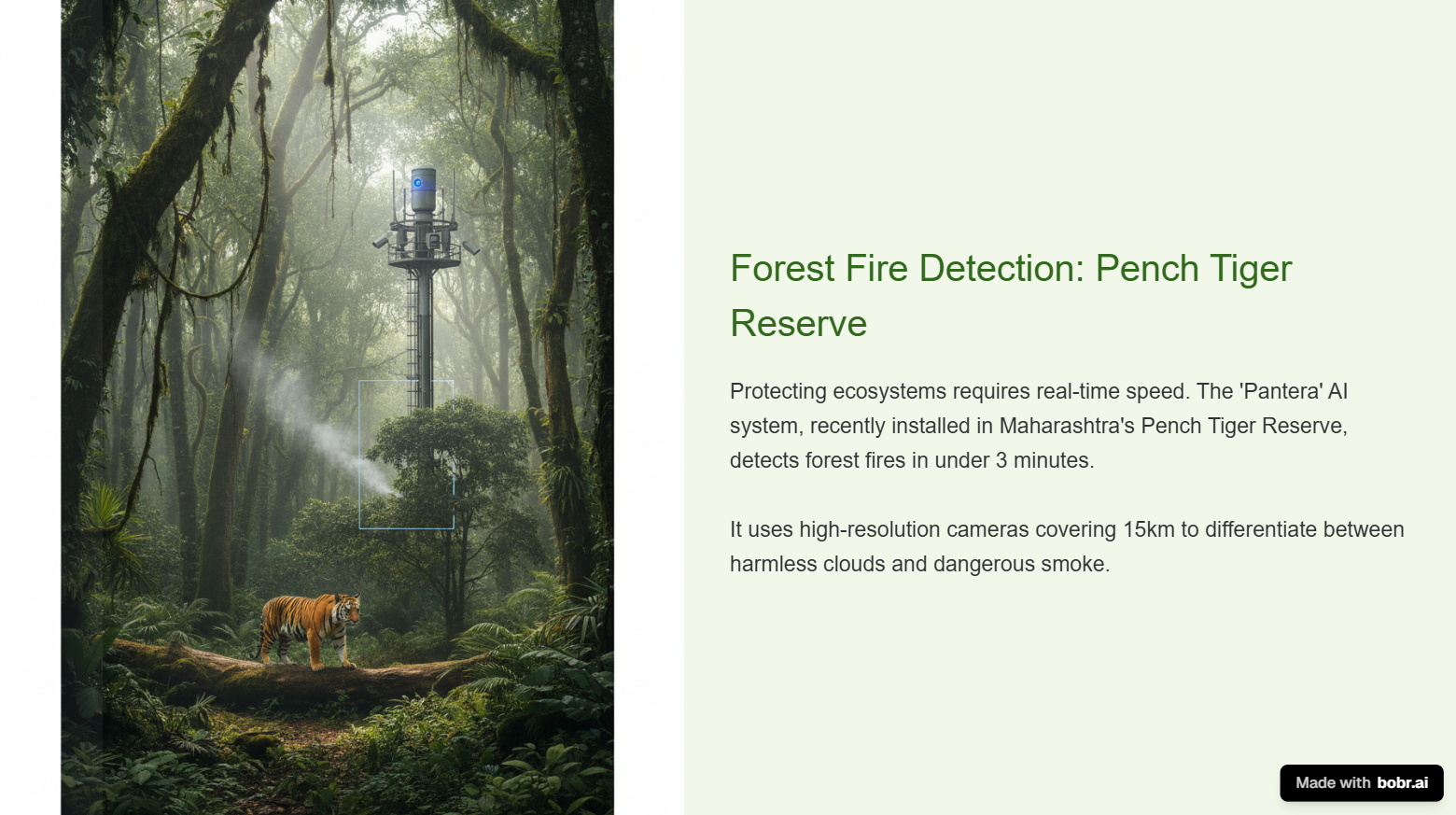 AI uses high-resolution vision to protect ecosystems from devastation. • **Technology**: 'Pantera' AI system differentiates smoke from clouds in real-time. • **Speed**: Detects fires in under 3 minutes. • **Coverage**: Cameras classify risks over a 15km radius.