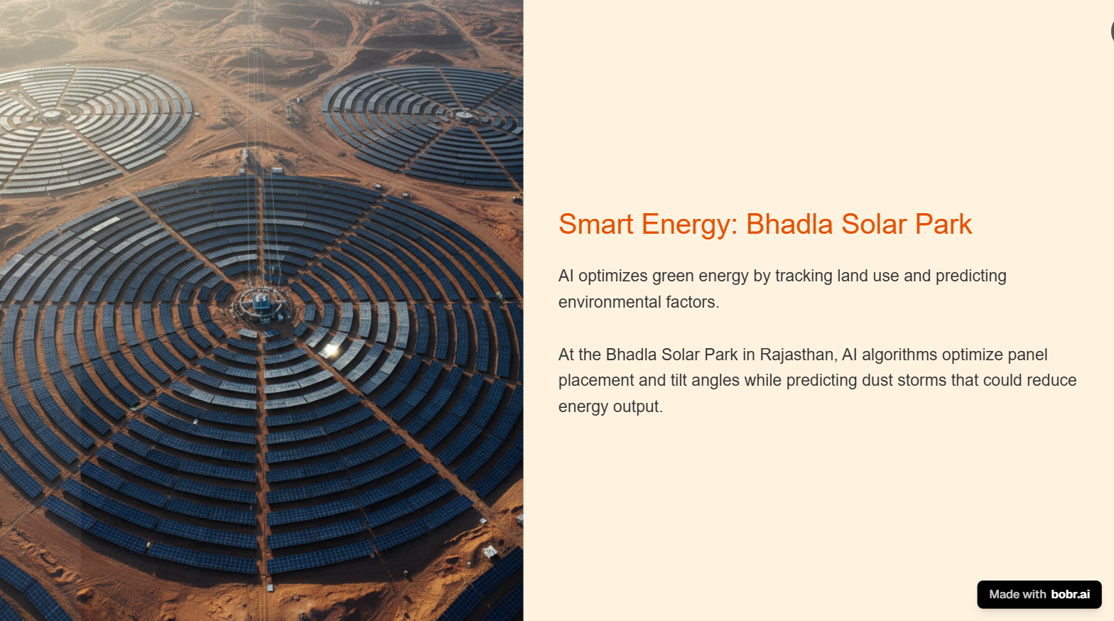 AI algorithms optimize green energy infrastructure by analyzing terrain and weather patterns. • **Location**: Bhadla Solar Park, Rajasthan. • **Optimization**: AI places panels and adjusts tilt for maximum efficiency. • **Resilience**: Predicts incoming dust storms that reduce output.