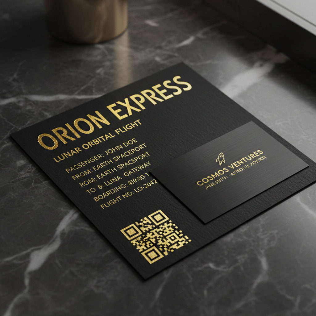 • Boarding Ticket mit Goldprägung • Visitenkarte (Metall/Carbon-Optik) • Branding Elemente: QR-Code, Mission ID, Partnerlogos