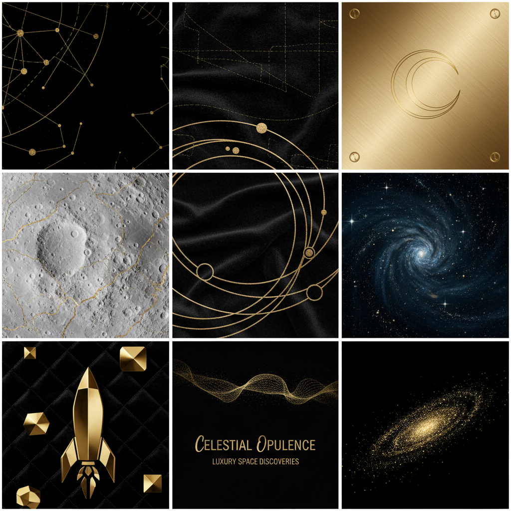 Kombination aus: • High-Tech Materialien (Carbon, Titan) • Warmem Luxus (Samt, Gold) • Weltraum-Texturen (Sterne, Krater)