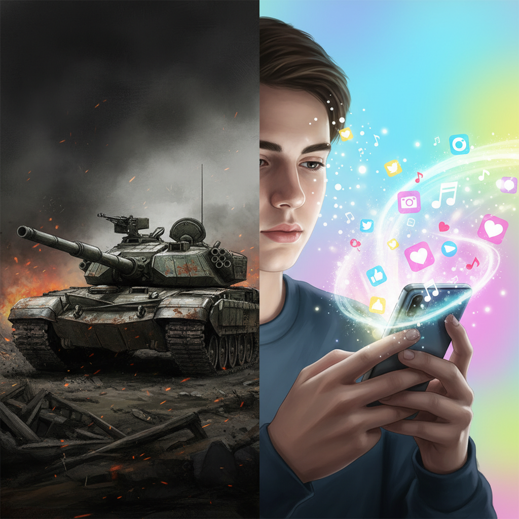 Die zentrale Frage: Wie werden Instagram, TikTok & Co. zur Waffe?<br><br>Der Slogan "Make Posts Not War" verdeutlicht den Konflikt zwischen digitaler Anteilnahme und der physischen Realität des Krieges. Es entstehen zwei parallele Fronten: