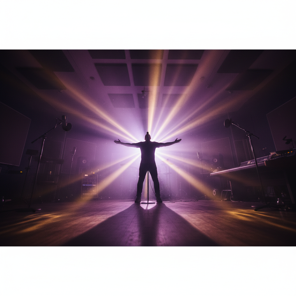 CRANE SHOT: Camera rises from floor to overhead as artist spreads arms. Volumetric beams of light blast through haze.