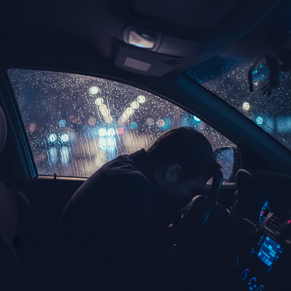 SETTING: Interior Car (Night/Rain). The lowest point.