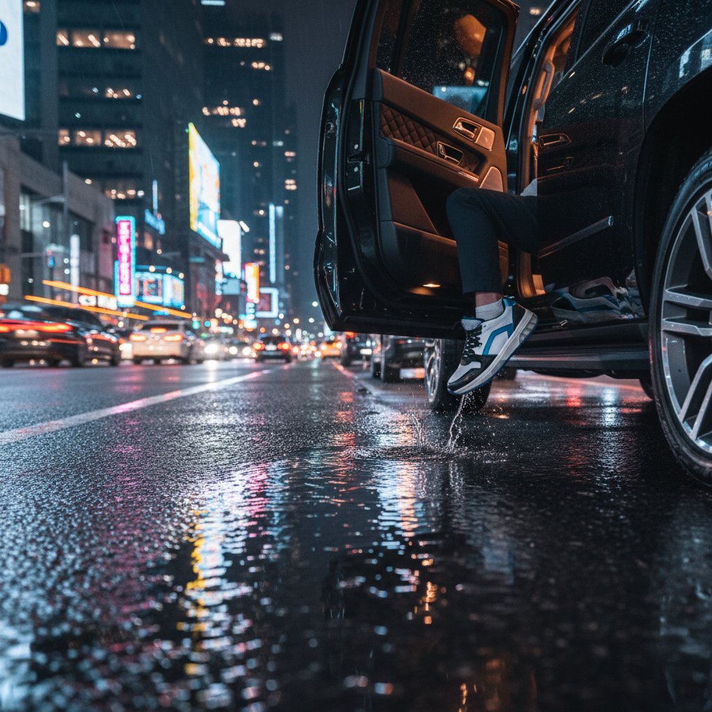 • EXT. STUDIO: Drone descends on neon-lit building (Night). • LOW ANGLE: Designer sneakers step into puddle (Rim light). • ECU WATCH: First reveal. Diamond timepiece catches streetlight.