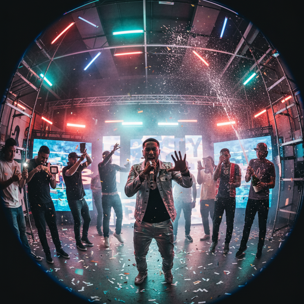 Entourage vibing, strobes flashing, champagne popping. Dynamic RGB lighting. The 'Godlike' angle.