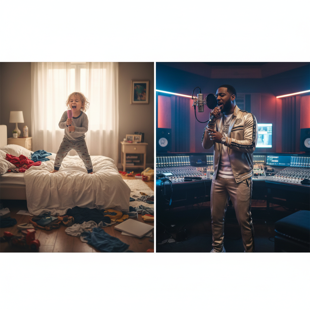 Seamless Transition: Child actor with hairbrush -> Adult artist with microphone.
