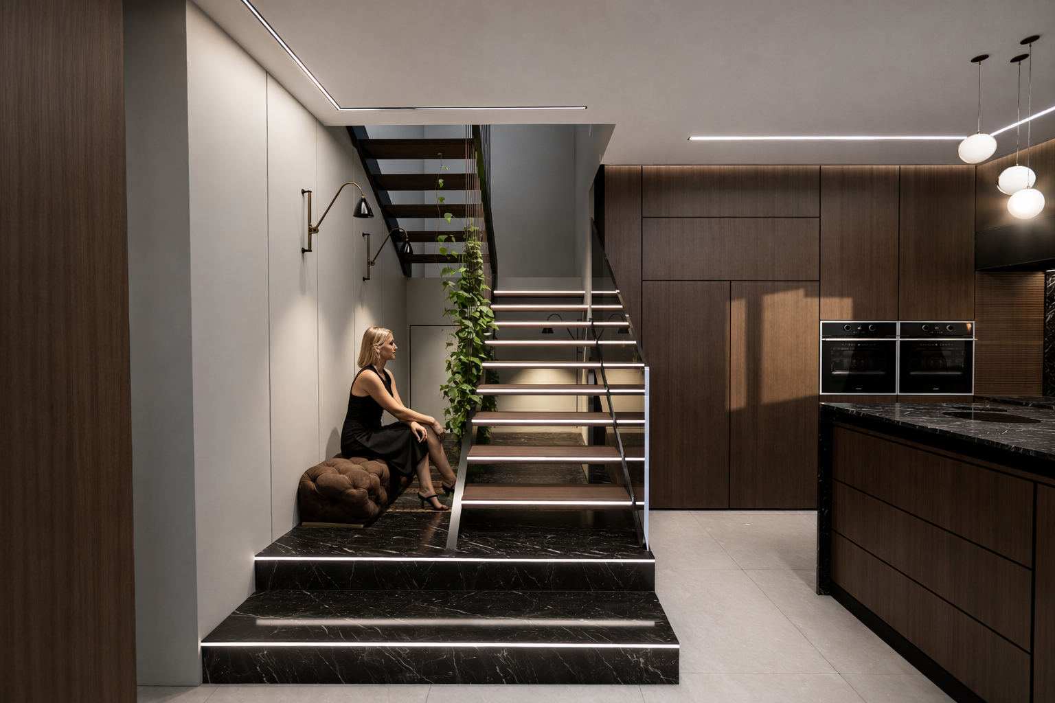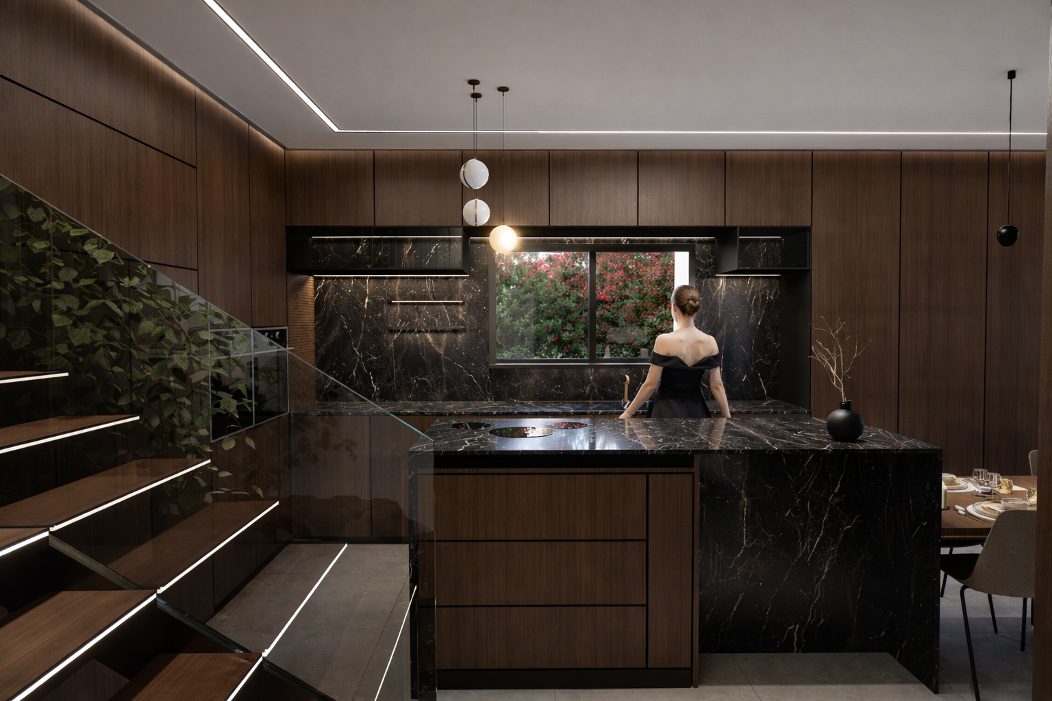 Explore a luxury interior design showcase featuring dark walnut veneers, Nero Marquina marble, and contemporary minimalist aesthetics for a modern home.