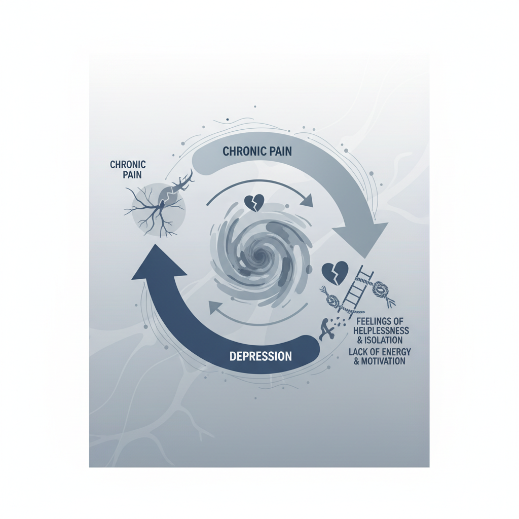 <ul><li><strong>The Pain-Depression Cycle:</strong> Chronic pain depletes serotonin and dopamine, worsening mood.</li><li><strong>Hopelessness:</strong> Pain limits activity, leading to isolation and reduced quality of life.</li><li><strong>Anxiety & Panic:</strong> Physical symptoms (palpitations, breathlessness) often mimic cardiac events.</li><li><strong>Impact on Care:</strong> Reduced motivation for rehab or self-care routines.</li></ul>